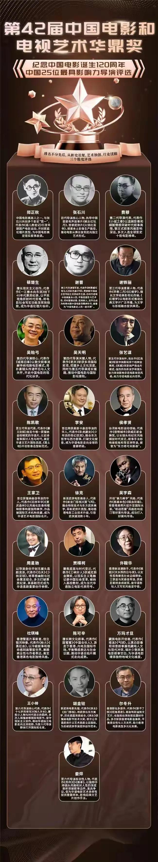 值此中国电影诞生120周年之际,万众瞩目的第42届中国电影和电视艺术华鼎奖,在香港正式揭晓“纪念中国电影诞生120周年·中国25位最具影响力导演”评选结果。