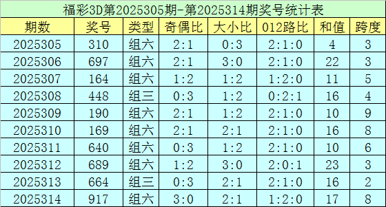 上期回顾:福彩3D第2025314期开奖号码为917,组选类型为组六,奇偶比为3:0,大小比为2:1。