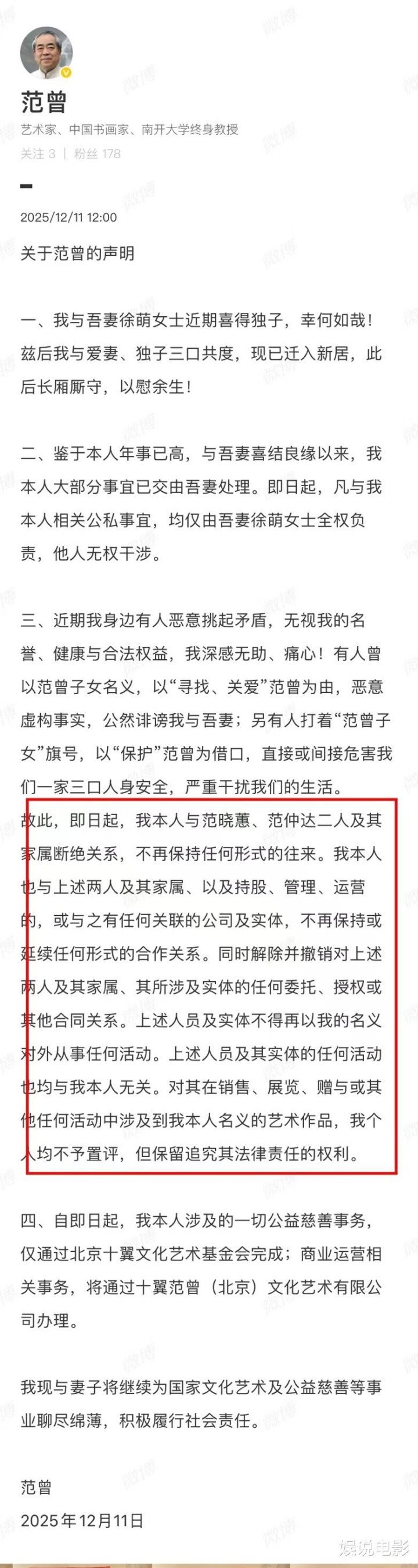 范曾的这个声明有很多值得解读的点,比如徐萌为他生了独子,所以女儿范晓蕙、继子范仲达就不是他的子女了。还有他指定37岁的娇妻徐萌成为他所有事宜的代理人,也就是说假如哪一天范曾离开人世了,而徐萌和她的儿子成为范曾的唯一继承人,当然如果他的这个声明没有去找律师公证,可能起不到法律作用,毕竟范晓蕙拥有血缘关系,而继子范仲达也是当年他给好友戴绿帽,第三任妻子带着两个儿子嫁给他,孩子改姓范。