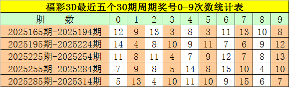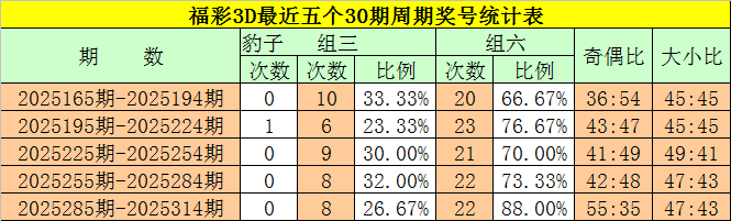 在最近一个30期周期内(第2025285期-第2025314期),豹子奖号没有出现,组三奖号开出了8次,所占比例为32%,组六奖号共出现22期,开出比例为88%,上期出现组六号码之后,本期看好组六号码继续开出。